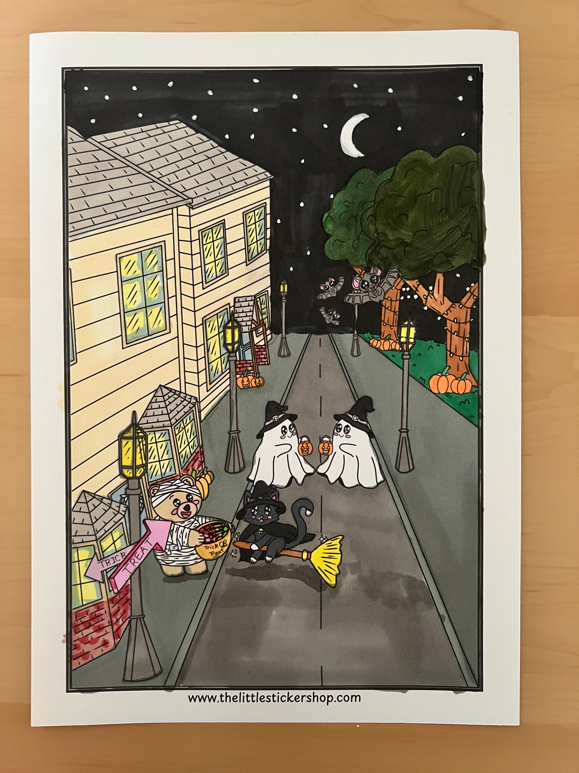 Halloween Trick or Treat Colouring Page - Cute Mummy Bear, Witch Cat, Bat & Ghost | Printable Digital Download